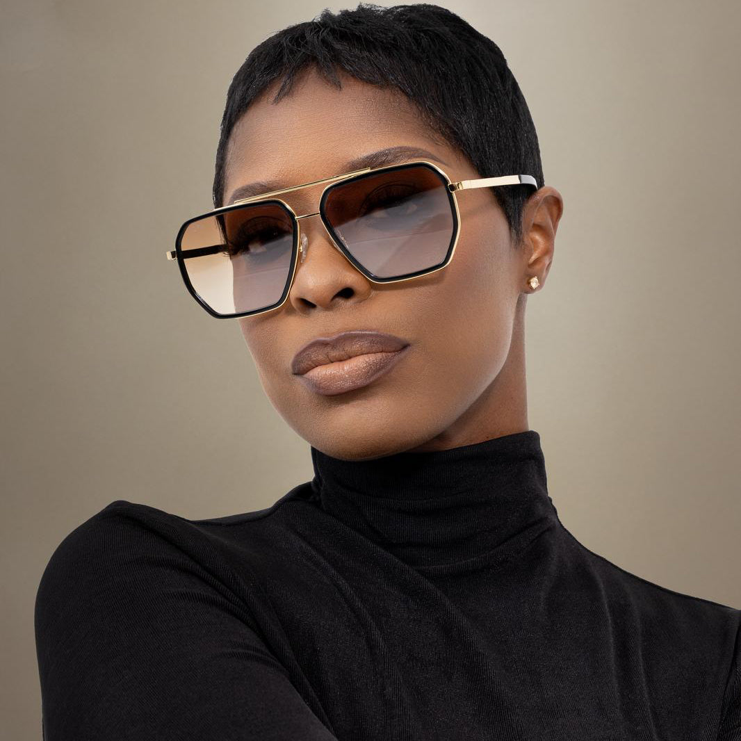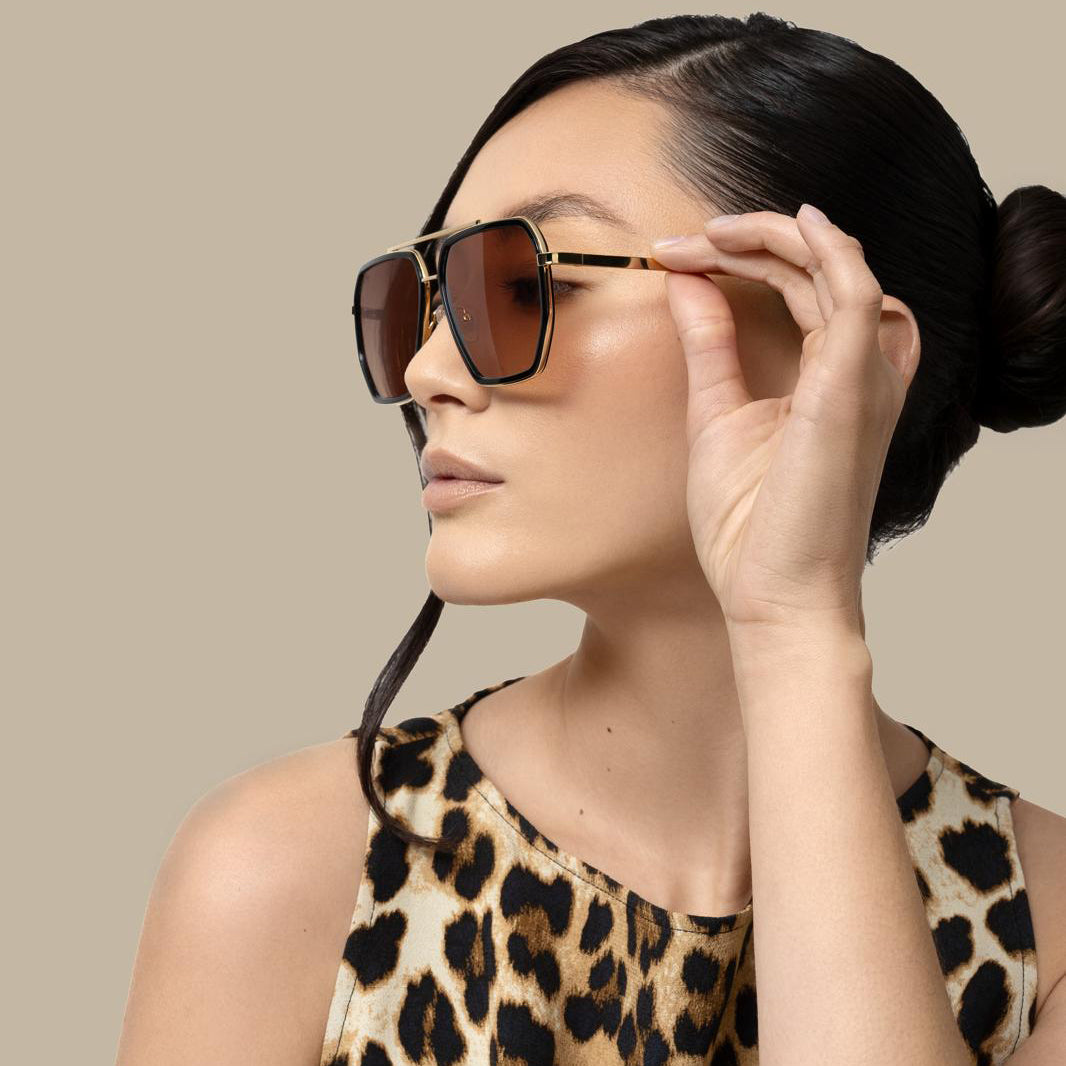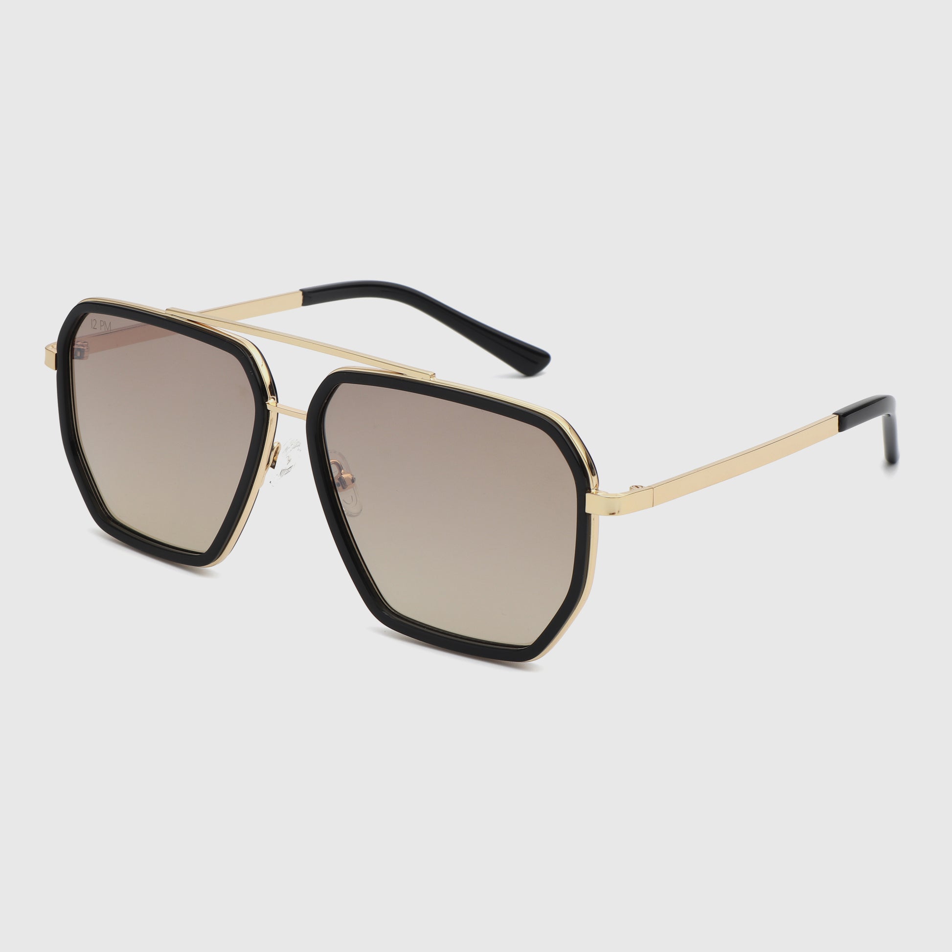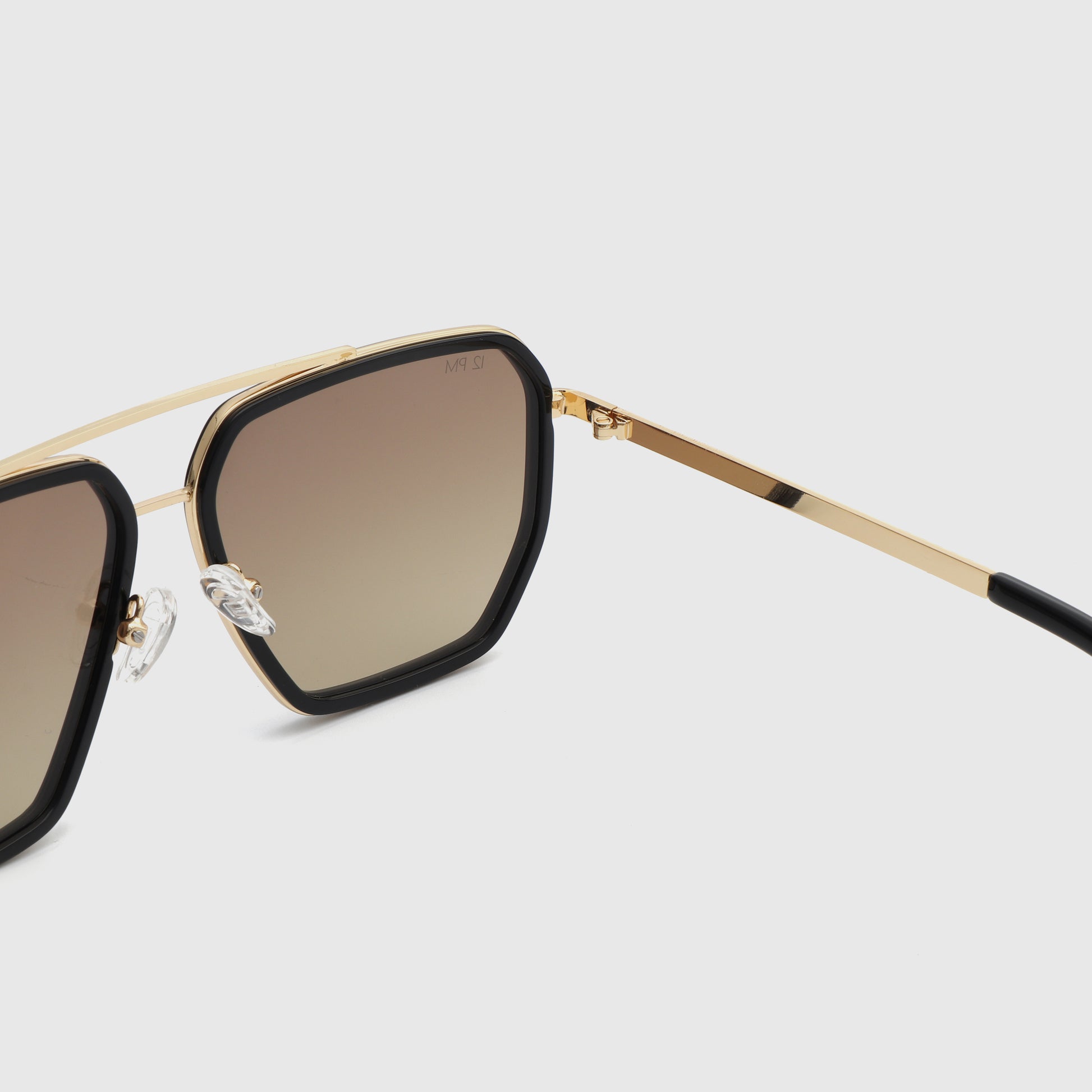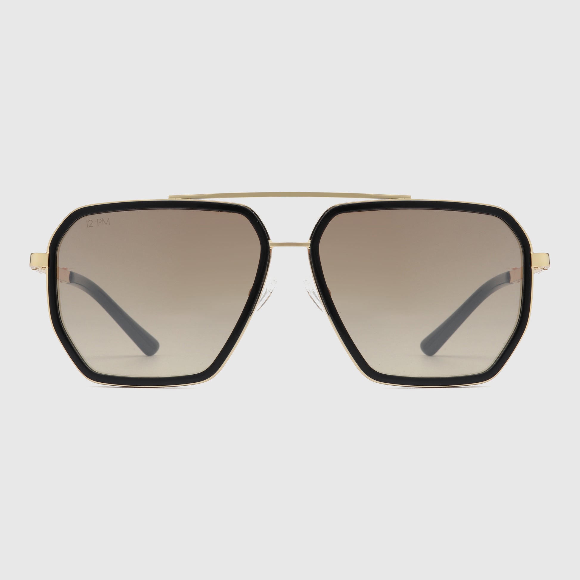 Meet LAGOS: A masterclass in quiet confidence. This geometric frame blends polished gold-tone metal with rich black inlay accents, offering a timeless silhouette that feels both architectural and elevated. The soft gradient lenses evoke warmth, ease, and sophistication with every wear.
