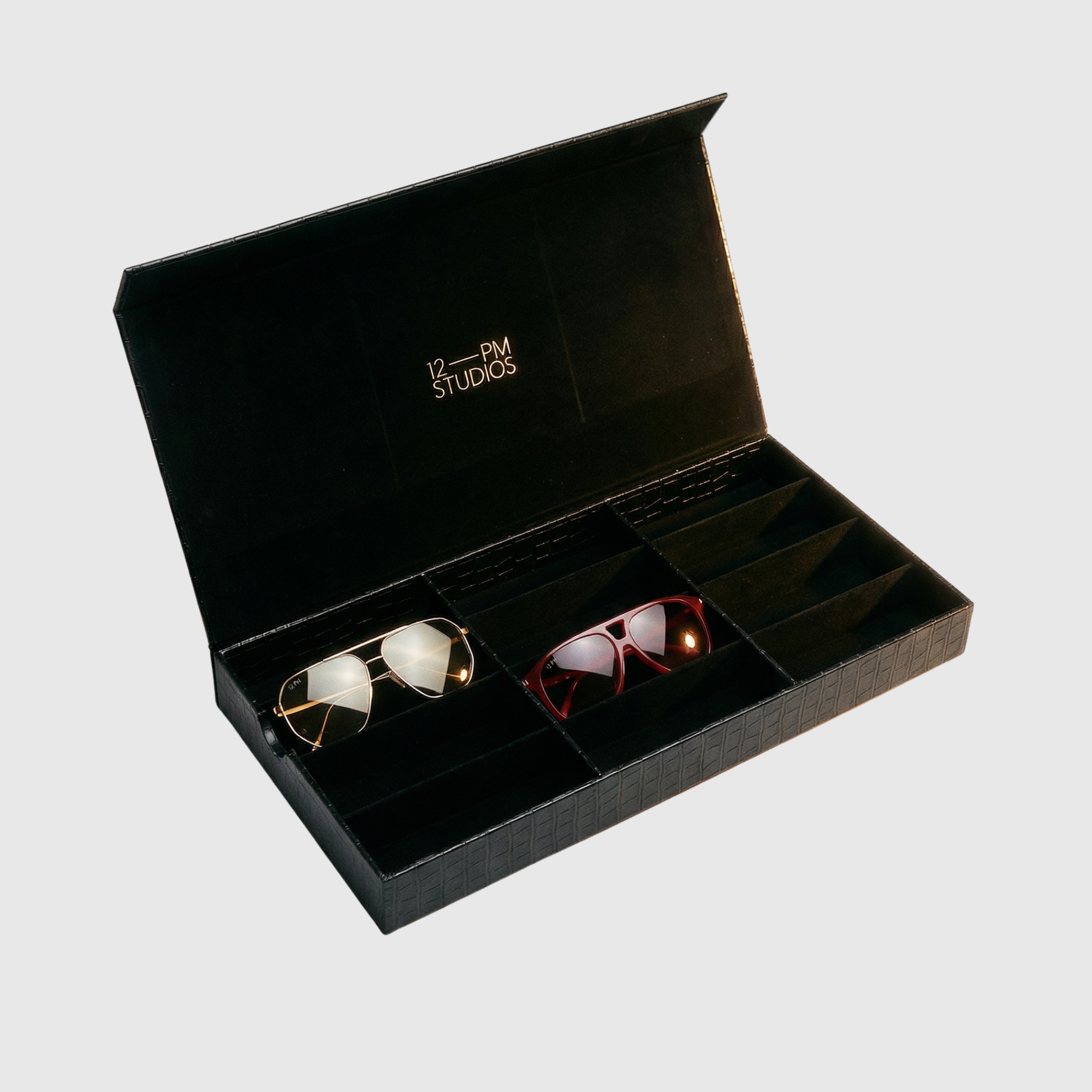 The 12PM Studios Sunglass Organizer is crafted in a luxe black croc-embossed finish with subtle linear texture and our gold-foil logo embossed on top making it as beautiful as it is practical.